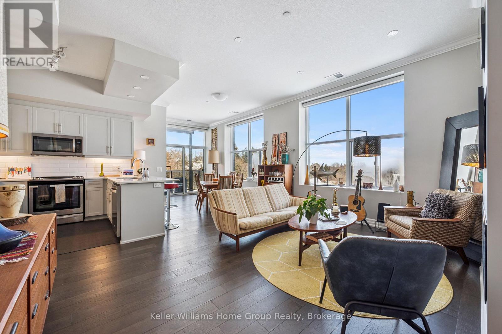 Enjoy effortless luxury living in one of Guelph's most prestigious locations. Corner Unit #211 at 1878 Gordon St. features 2 bedrooms, 2 full bathrooms with 1 underground parking spot. This spacious and bright unit is beautifully designed and filled with natural light. Exceptionally designed interior living space with modern luxury finishes including 9-ft ceilings, a large kitchen with premium stainless steel appliances, quartz countertops, under-mount cabinet lighting, an island, and ample room for a dining room table. The living room features a cozy electric fireplace. The primary bedroom features a beautiful ensuite bathroom with double sink vanity and a glass walk-in shower plus a walk-in closet. The second bedroom features a Murphy Bed installed, perfect for a second bed or to be stowed away for guests but offering space for a home office, workout room, or a sunny reading room. The building provides tremendous amenities including underground parking, controlled entry, fitness centre, guest suite, golf simulator, games room and much more. With the ability to walk to shopping, parks, schools and with quick access to 401... this unit truly has it all! (id:52560)